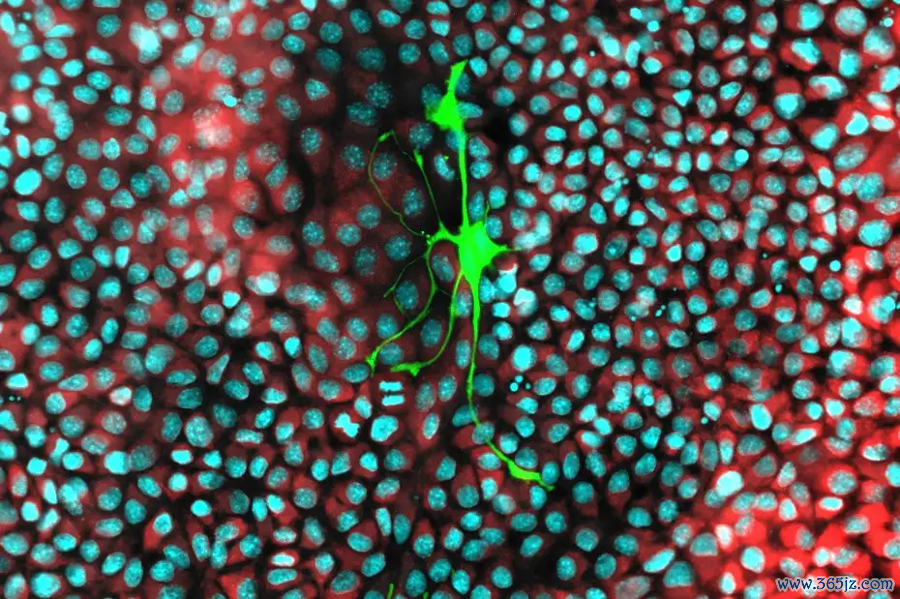 在癌细胞培养物中助长的神经细胞(染成了绿色)。(图源:英国《新科学家》网站)